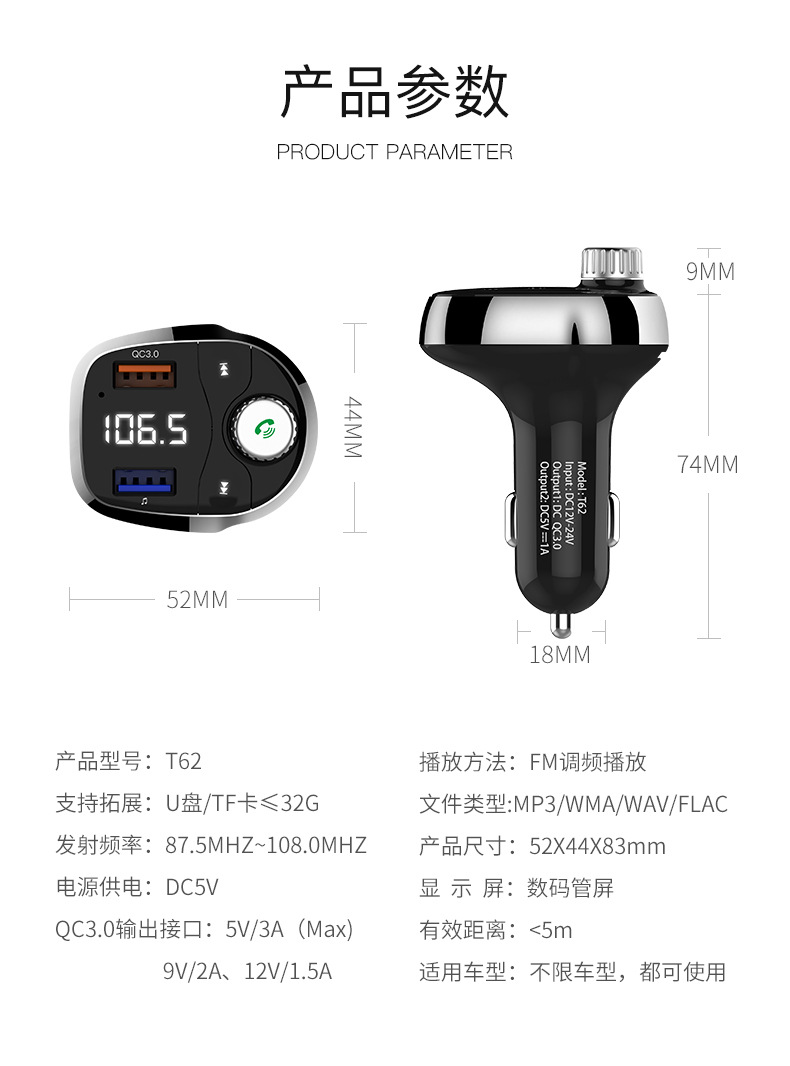 TC62 车载免提电话蓝牙mp3播放器双USB汽车手机充电器QC3.0快